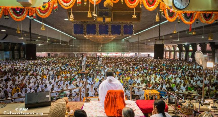 In my last post, I talked about making the decision to sit closer to the front of the room during programs instead sitting at the back or far sides of the hall. I have followed through on that commitment. Most often, I have been sitting on the floor in the section closest to Amma. I had forgotten what it is like to be surrounded by devotees who know the songs. The sound is so full and powerful.