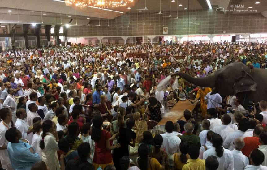 After the lunch, Amma fed Lakshmi, the ashram elephant, her lunch. This is always one of my favorite parts of Onam. After Lakshmi finished eating, Amma had her pick up, with her trunk, any food that had dropped on the floor. It always amazes me to see how well Lakshmi can clean up her mess.