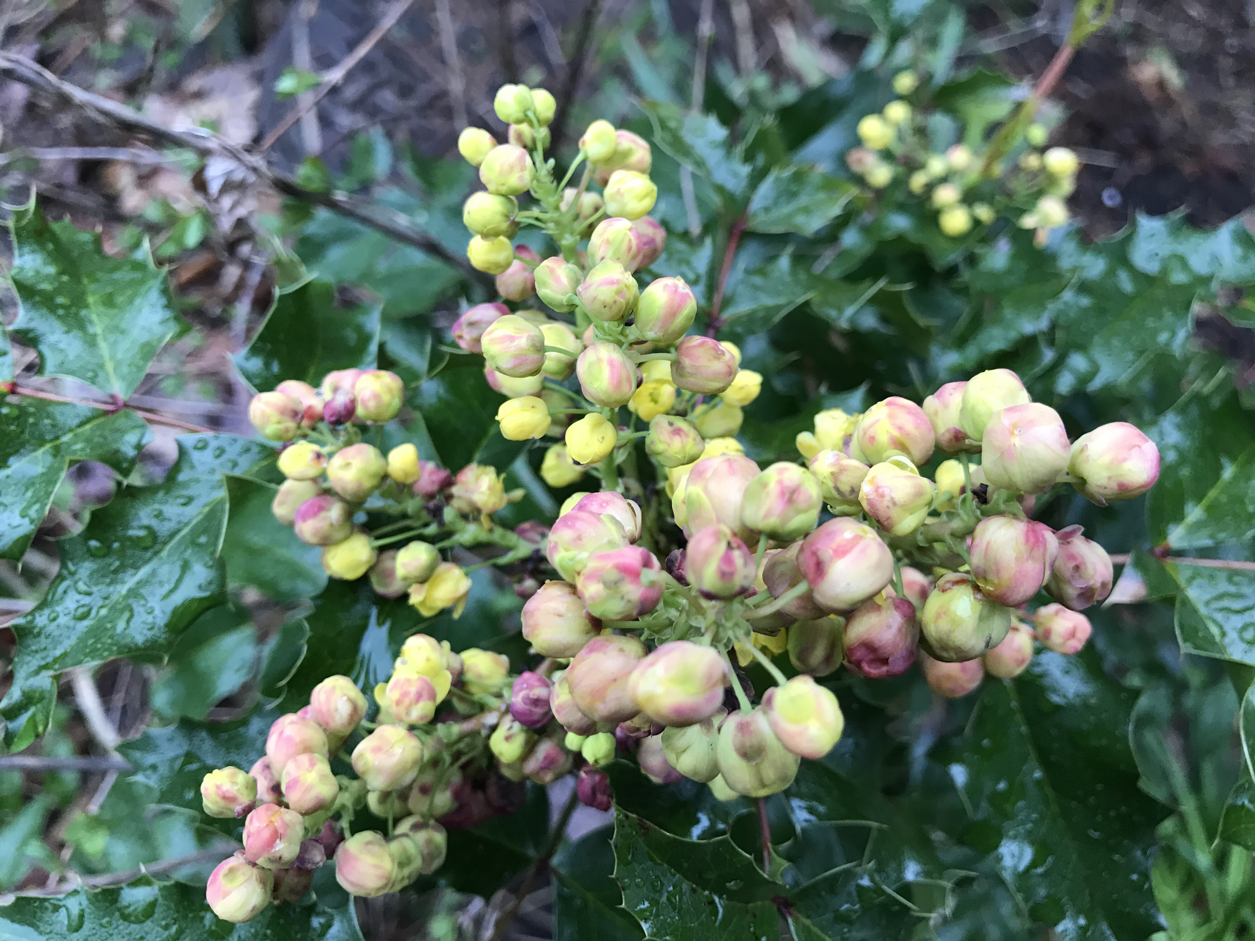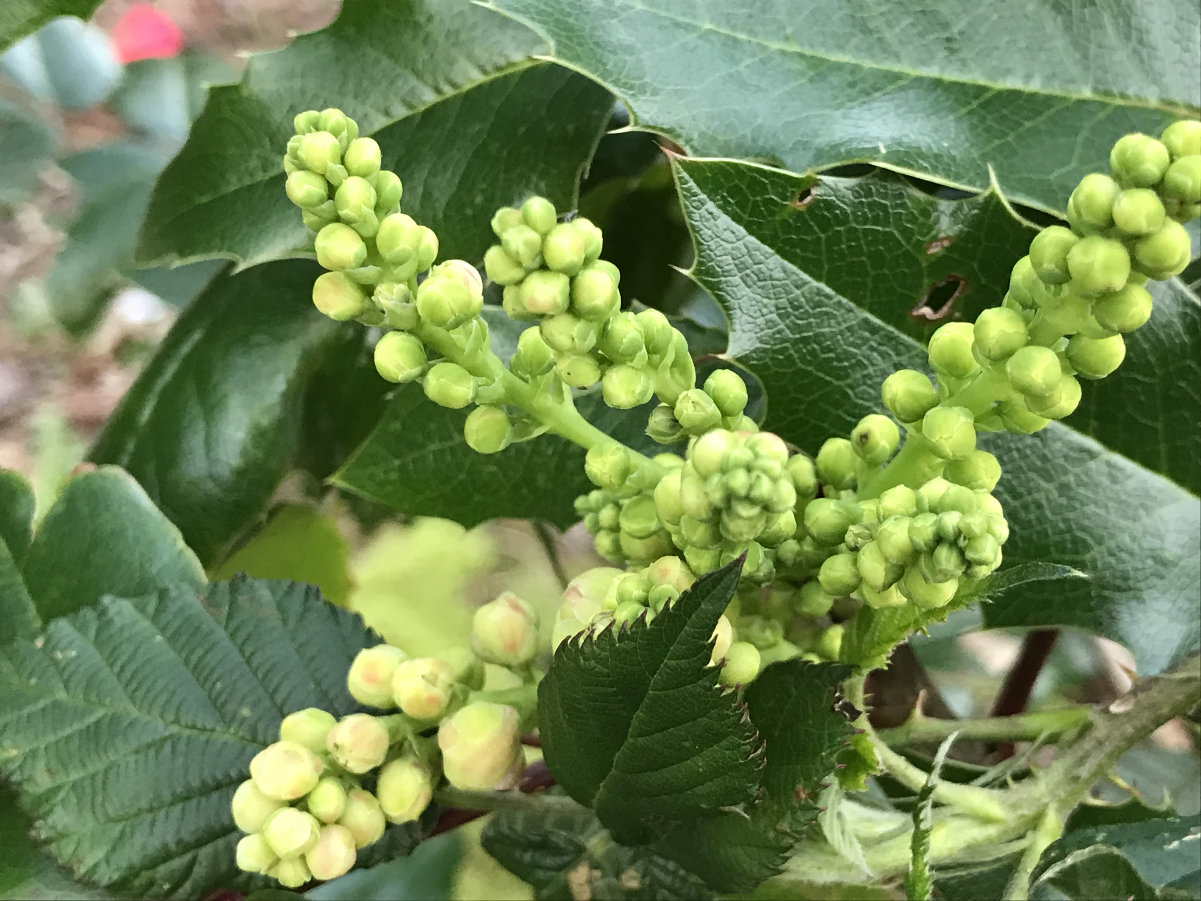We have so many Oregon Grape shrubs on the restoration site. Some of them north of the Hanford stairs were planted by Earth Corps 10-15 years ago. Some of the ones south of the stairs were planted by a neighborhood group 6-10 years ago. All of shrubs had been crushed by blackberry vines but thrived once they were freed from those invasive plants. We have also planted new Oregon Grape shrubs throughout the site.