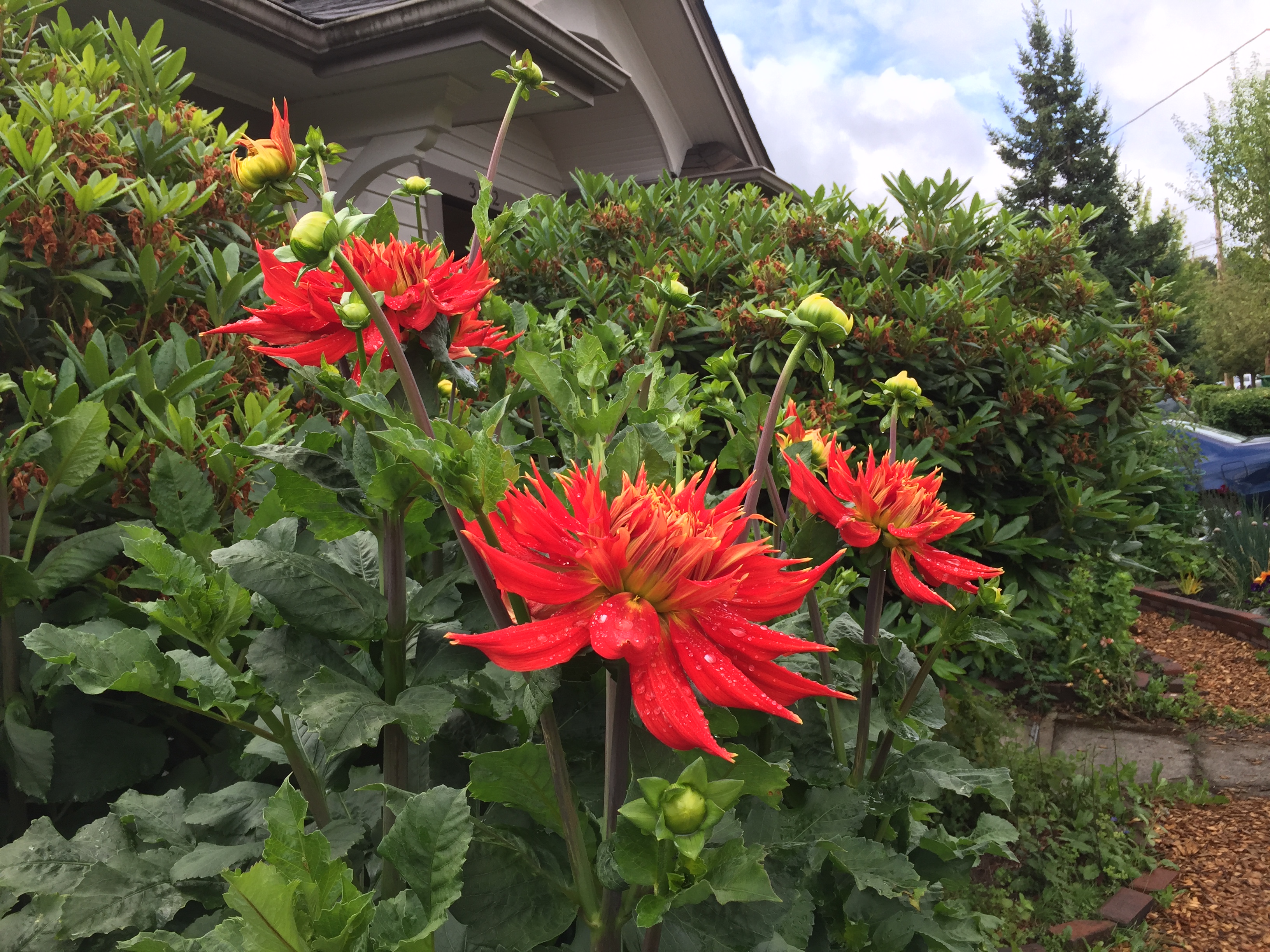 In my front yard there is a dahlia plant that has gigantic blooms. In mid to late summer it looks like this:
