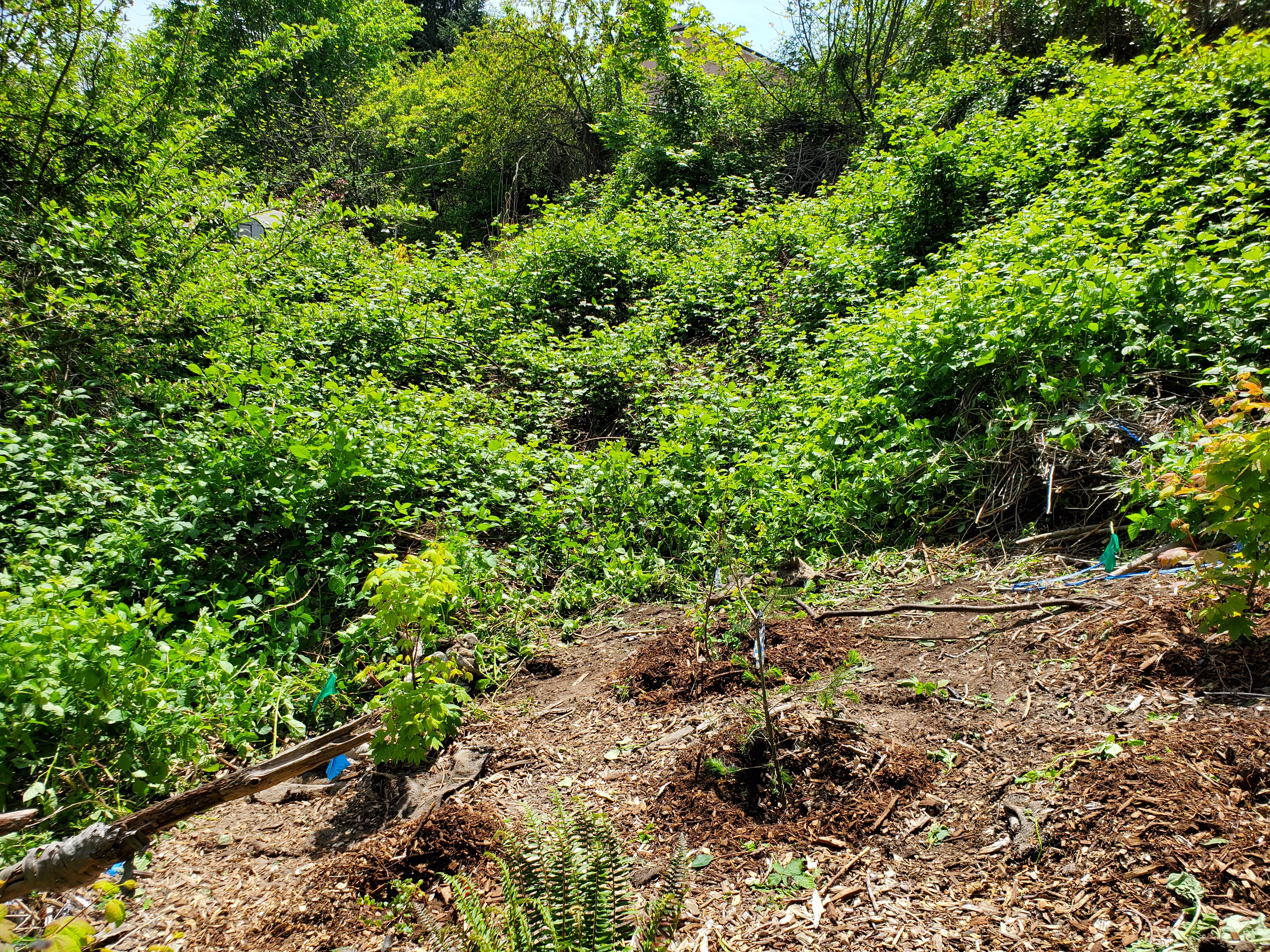 May 20 was the last service-learning session. Shirley and I decided the group would spend the whole time working on the new site across Cheasty Boulevard. We had begun to clear bindweed and other invasive vines from that area on April 29. This was what the land looked like before and during the April 29 work party.