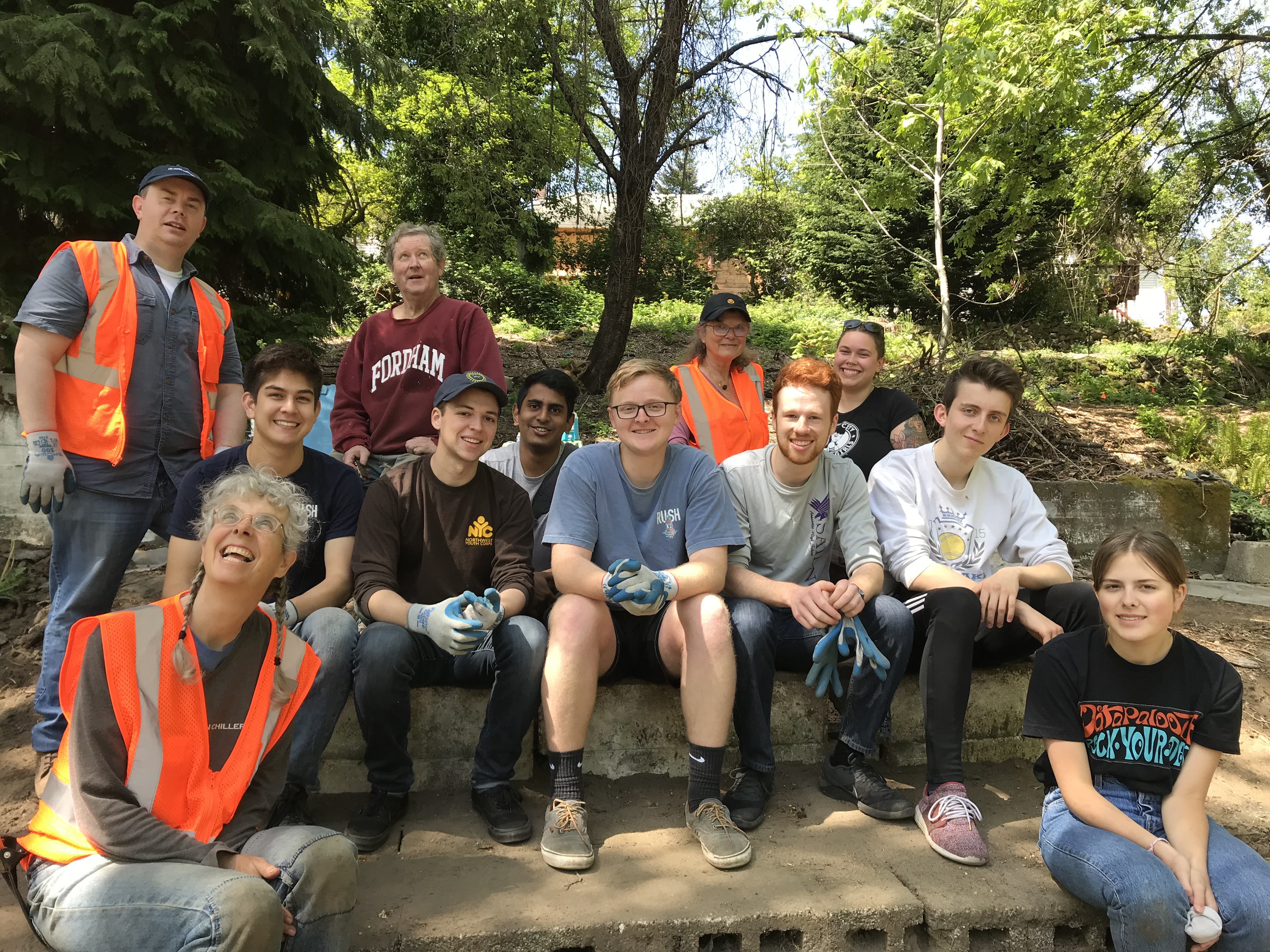 Even though the area was shady, we were all tired from working in the heat so stopped a bit sooner than we would have under normal conditions. After putting the tools and other supplies away, we gathered on the stairs to celebrate our achievements and to take a group photo.