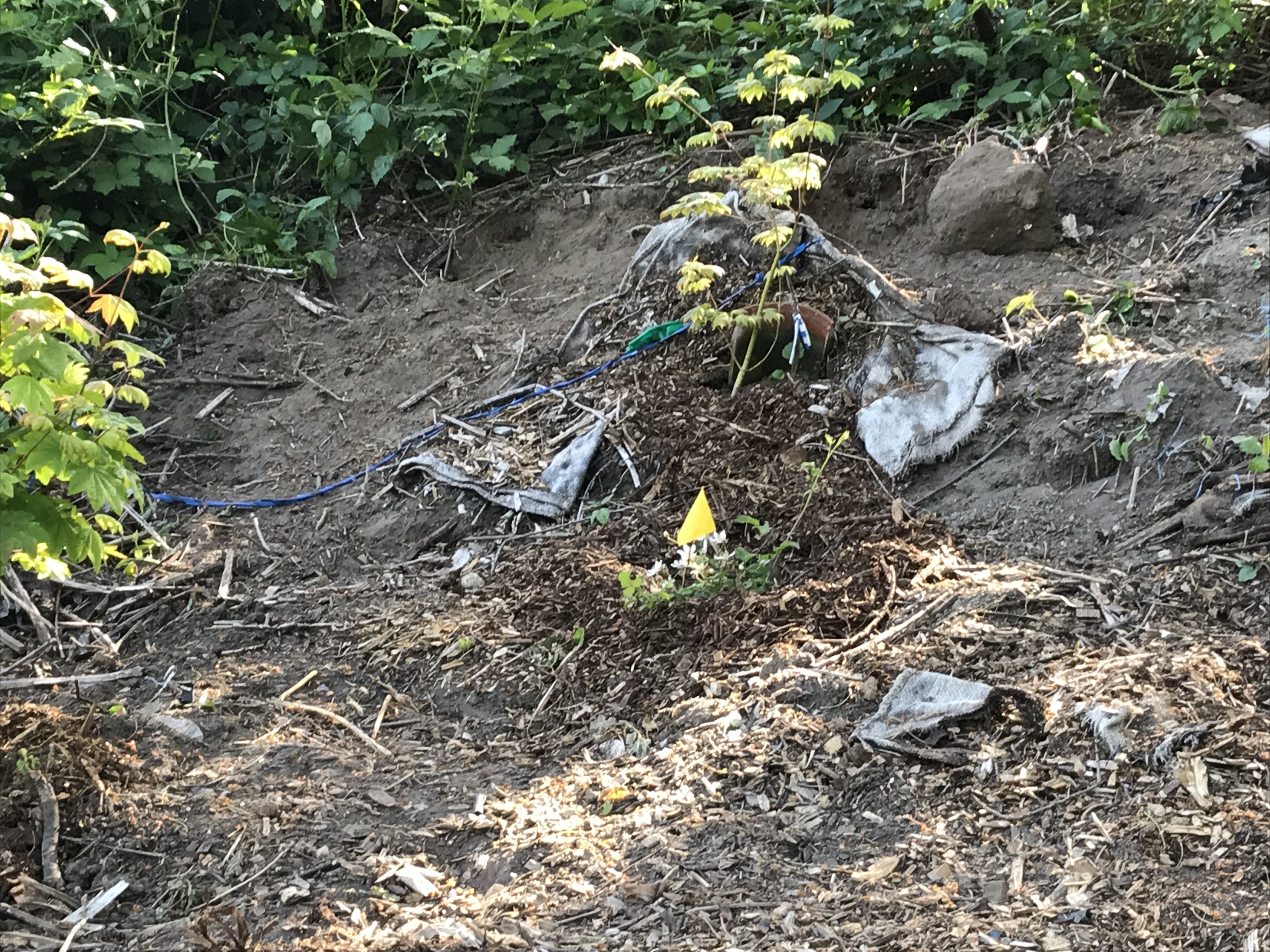 When I checked the site three weeks later, I could barely tell we had worked there before. “Oh No.” We cleared bindweed from that area again on May 20. Afterwards, we covered the area where we had “removed” the bindweed with wood chips. Even though we weren’t able to clear the whole area, the part we had “finished” looked beautiful.