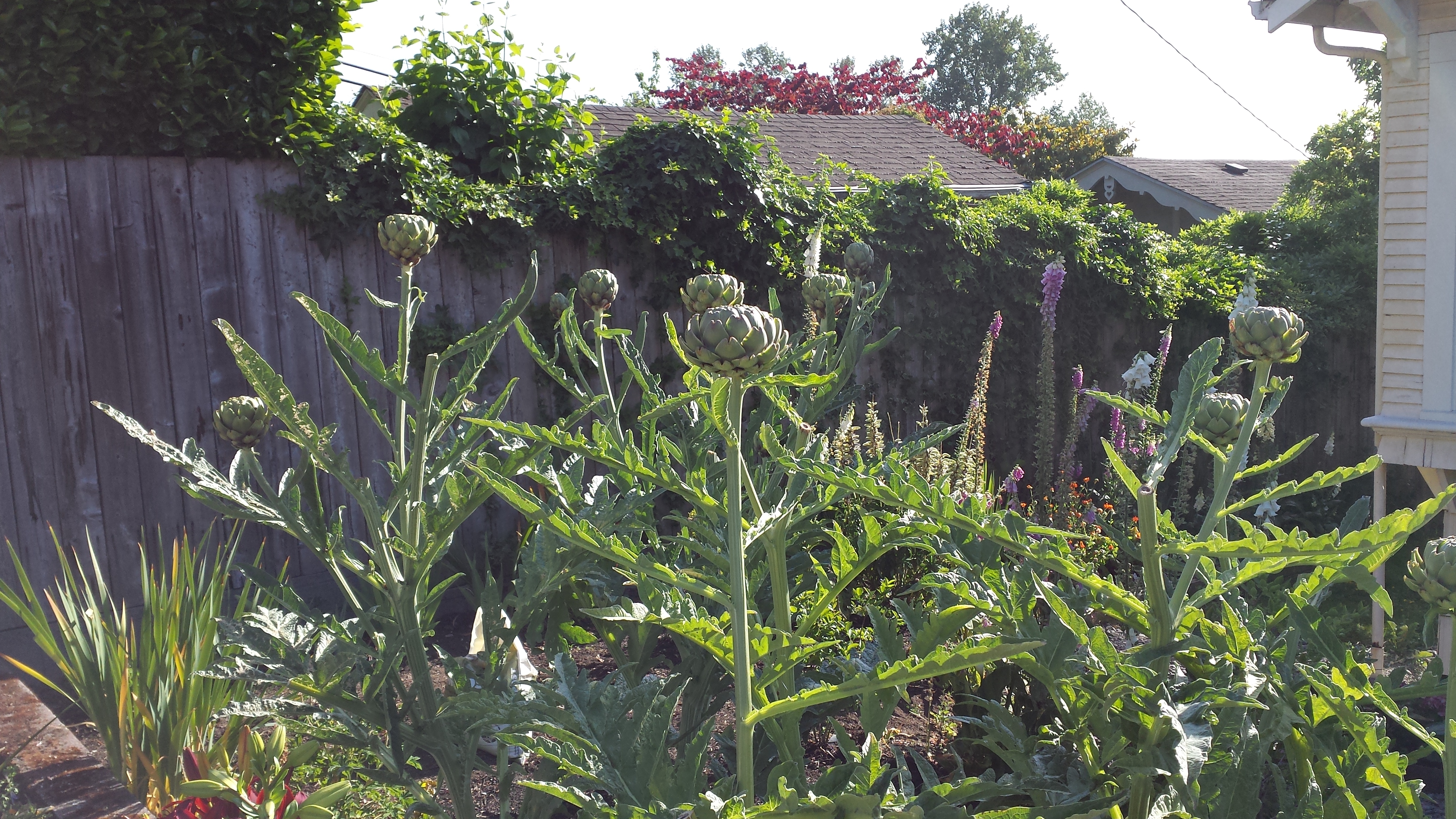 Perspective is an interesting thing. Each of these photographs show the artichoke plants from a different perspective. I don’t think it is possible to know the size of the plants from looking at any of the photos. If I had walked into my neighbor’s garden and stood next to the plants, which I didn’t, I believe they would have been about my height (5 ft 7 in).