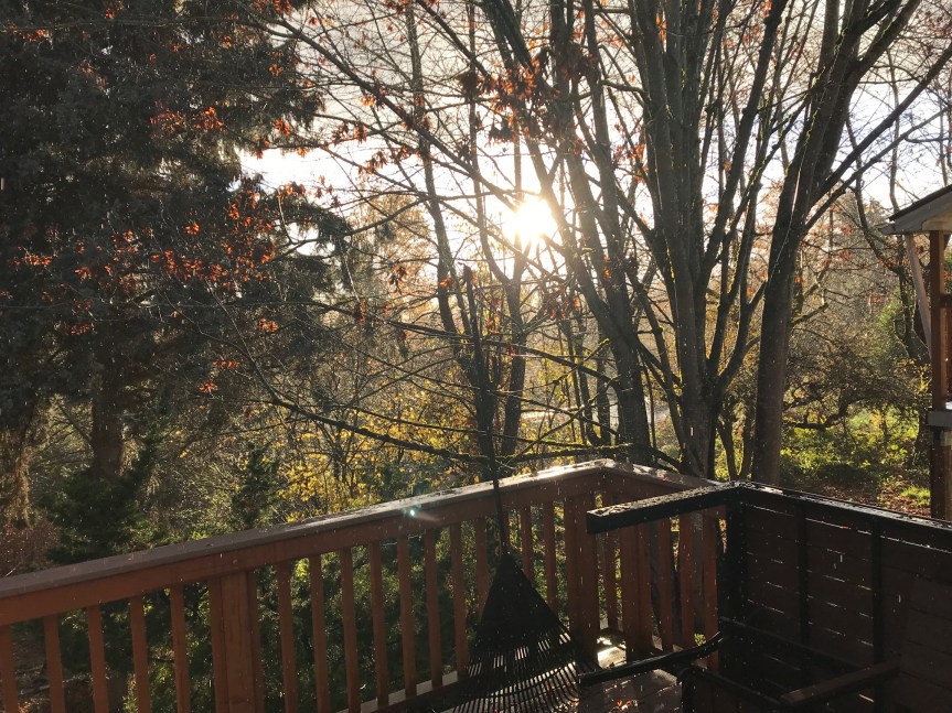 just after 8 a.m., I looked out of my dining room window and saw sunlight streaming through the trees. At the same time this was happening, it was raining. The sunlight made the raindrops sparkle. My photo doesn’t do this experience justice, but I hope, along with my words, it gives you a sense of the beauty I witnessed.