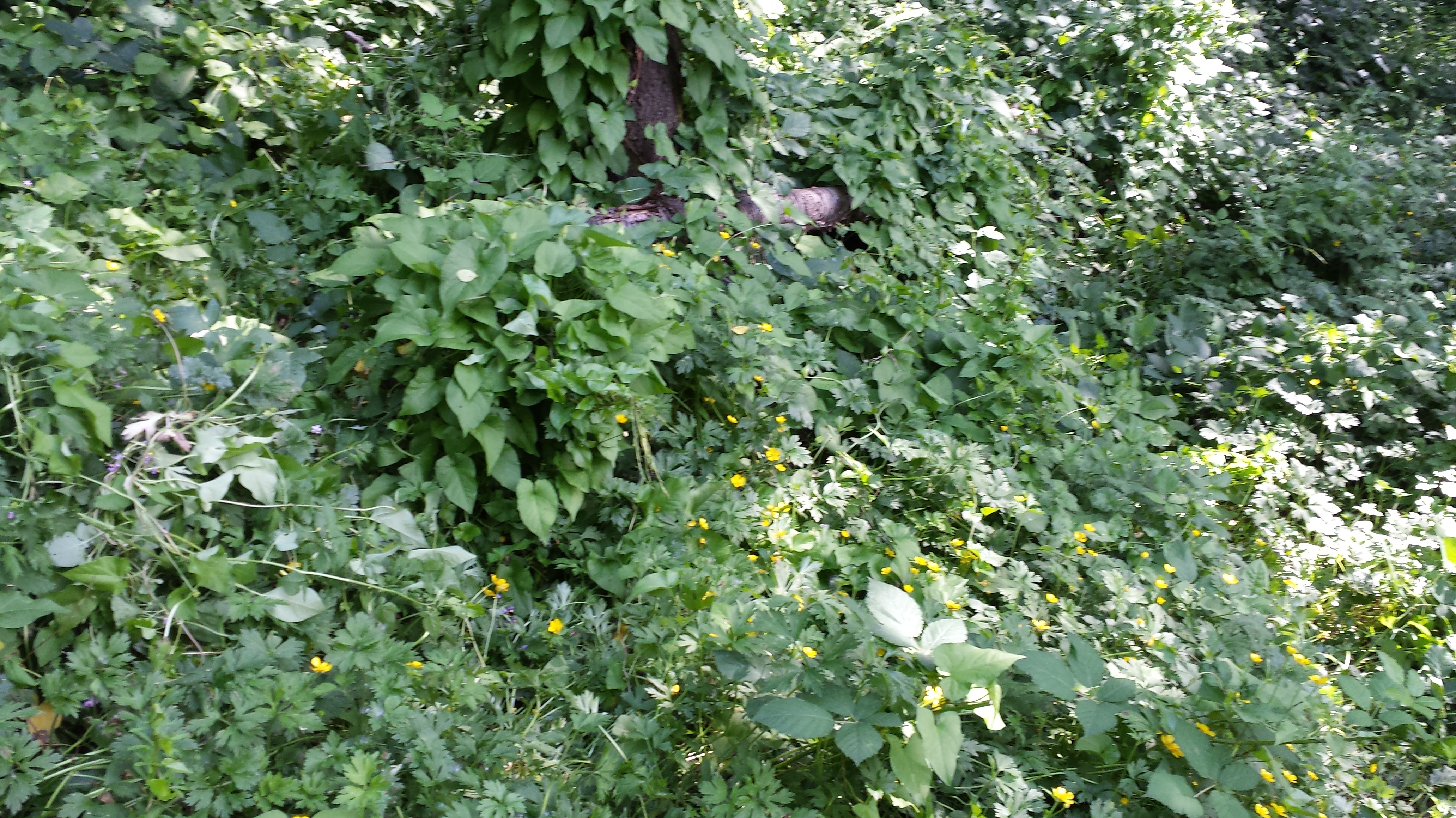Later, I began to think about the lot behind my house. That space would be much more private but it is filled with blackberries, ivy and morning glory vines. As I pondered that possibility, I remembered there used to be a secluded area under a cedar tree in that lot. I decided to see what that space looked like now.