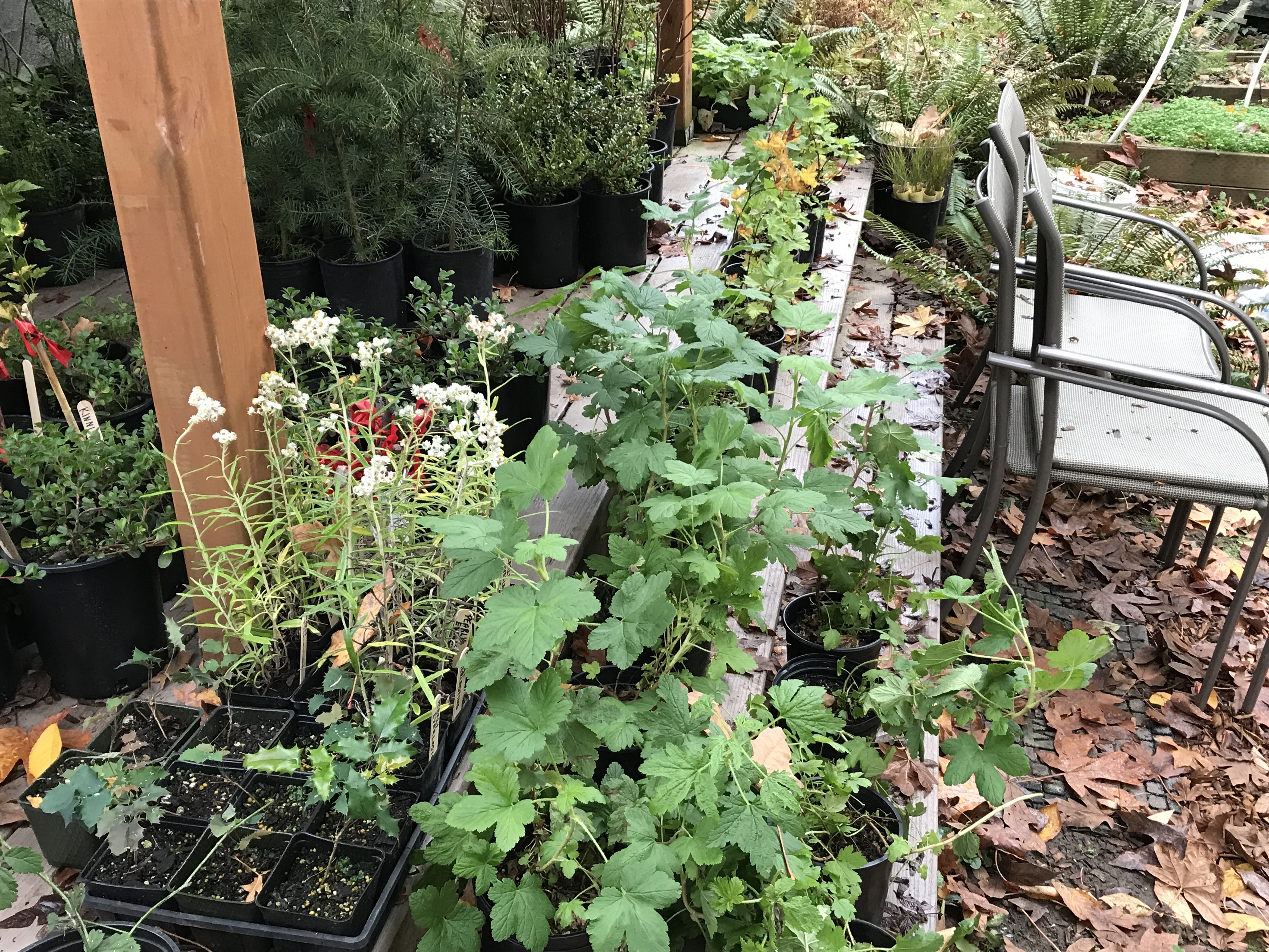 When the plants arrived at our forest restoration site in November of 2018, I was surprised by how small they were. In the photo below, there are ten Pearly Everlasting seedlings next to the deck post.