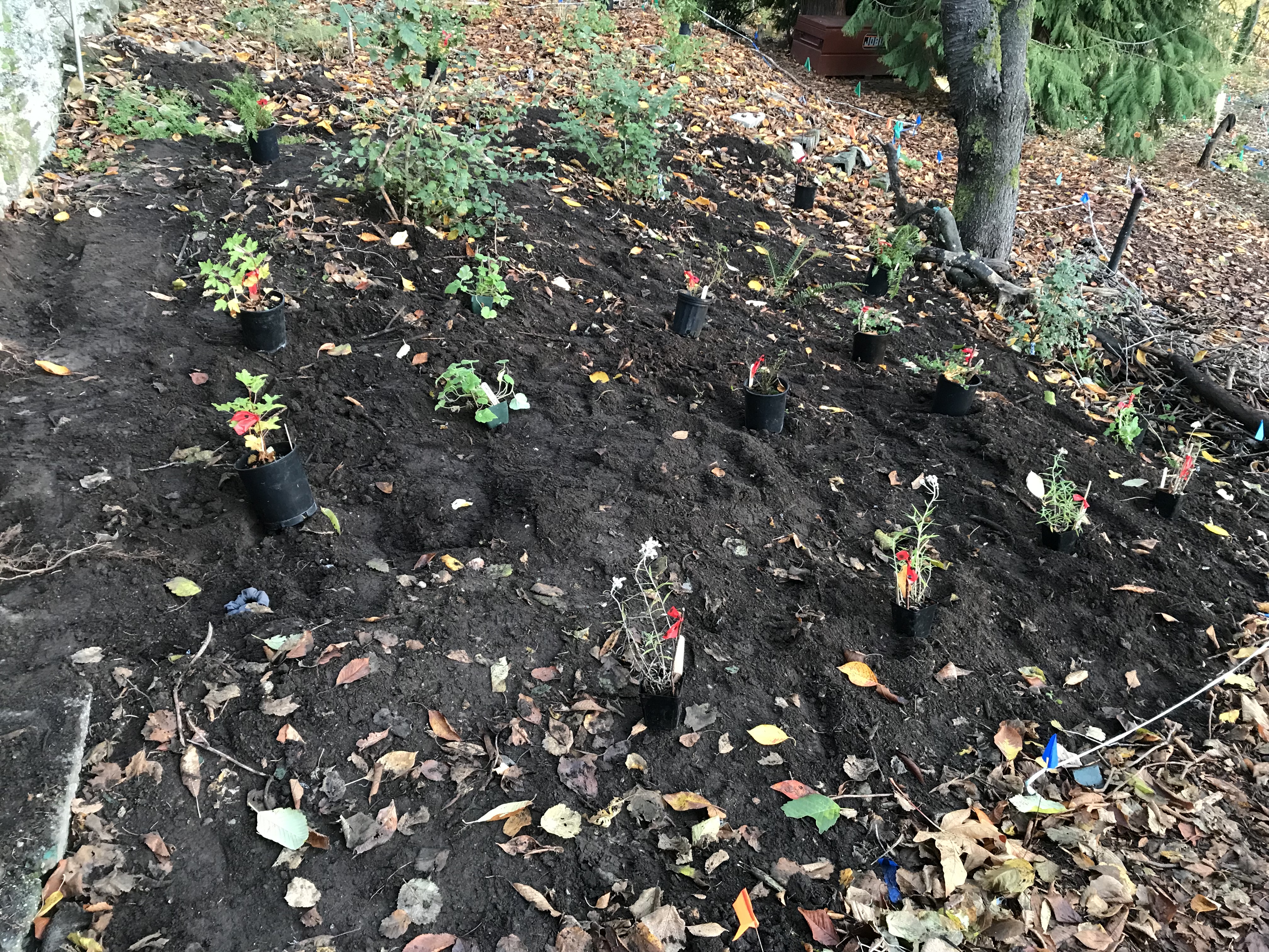 The Pearly Everlasting plants I saw in Discovery Park had been used as a border in hopes that they would keep park visitors on a trail rather than walking through vulnerable plants. I decided to try that rationale in our site too. Four of the Pearly Everlasting plants, still in their pots, are in the forefront of the photo below.