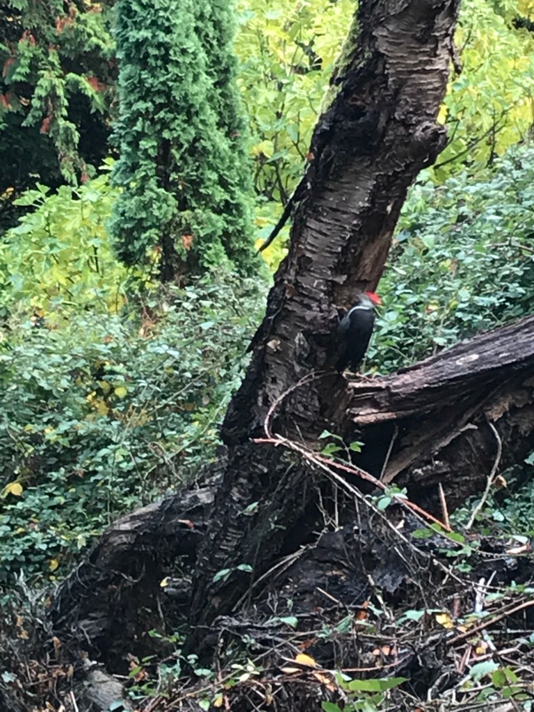 On Friday, I spent time working in our Greenbelt restoration site. As I turned to go back home, I heard a loud sound. It took a moment for me to figure out what it was. When I looked ahead of me, I saw a woodpecker pecking at a dead tree. It was unlike any woodpecker I’ve ever seen. One of the remarkable things about it was that it looked huge.