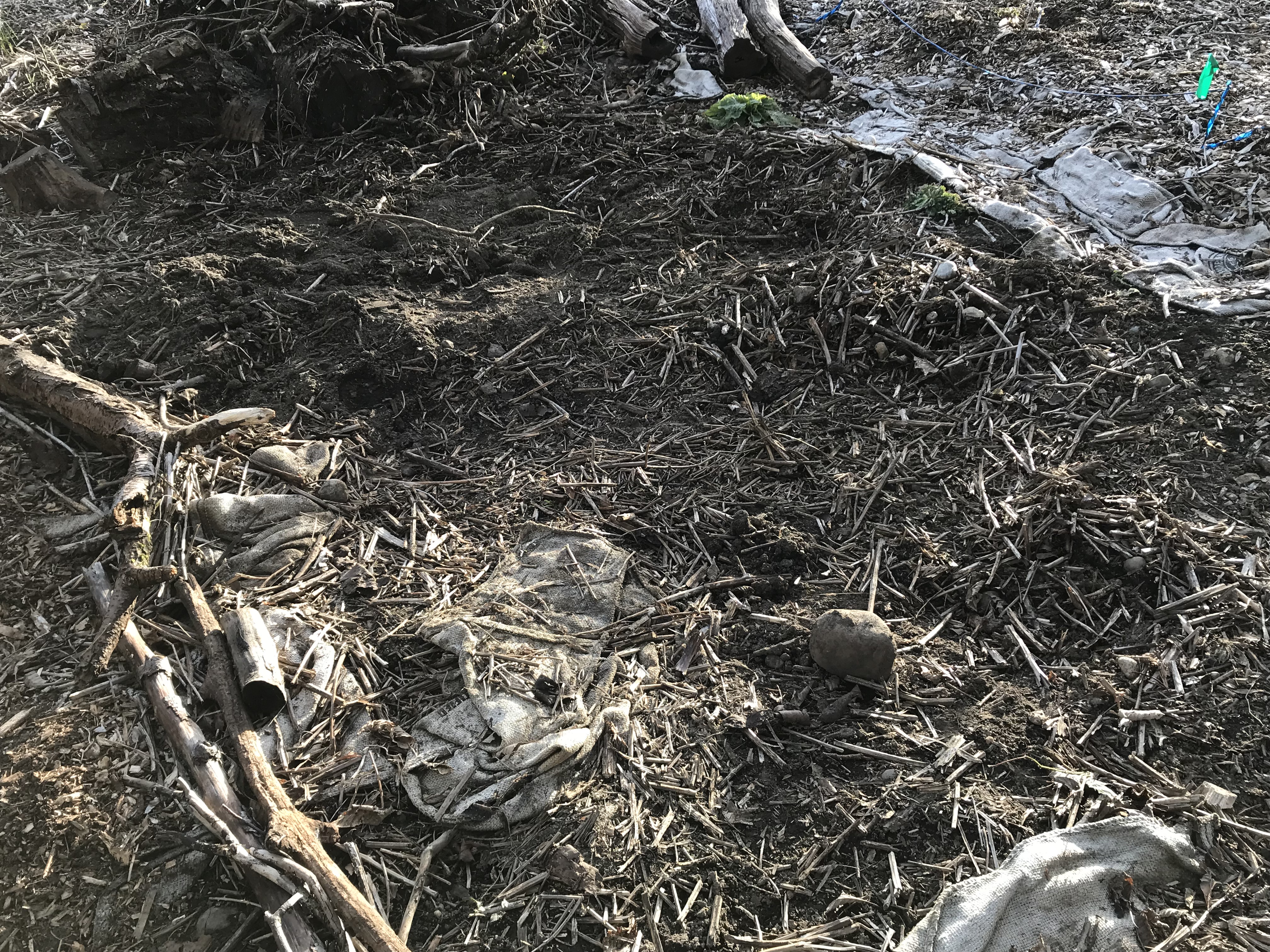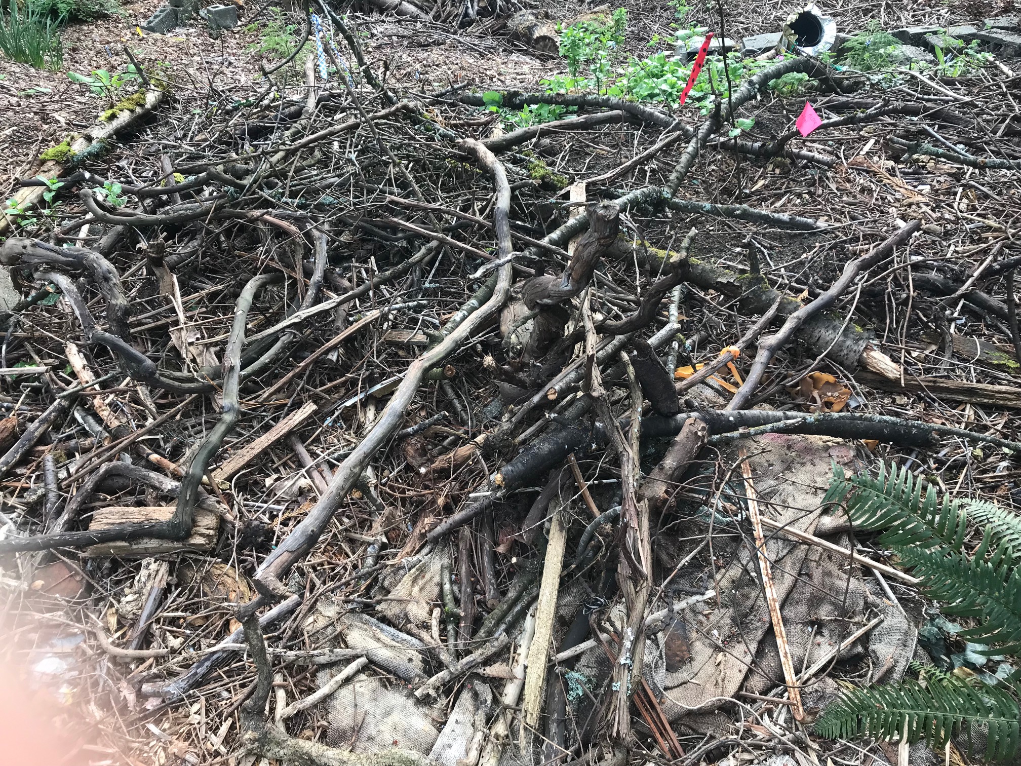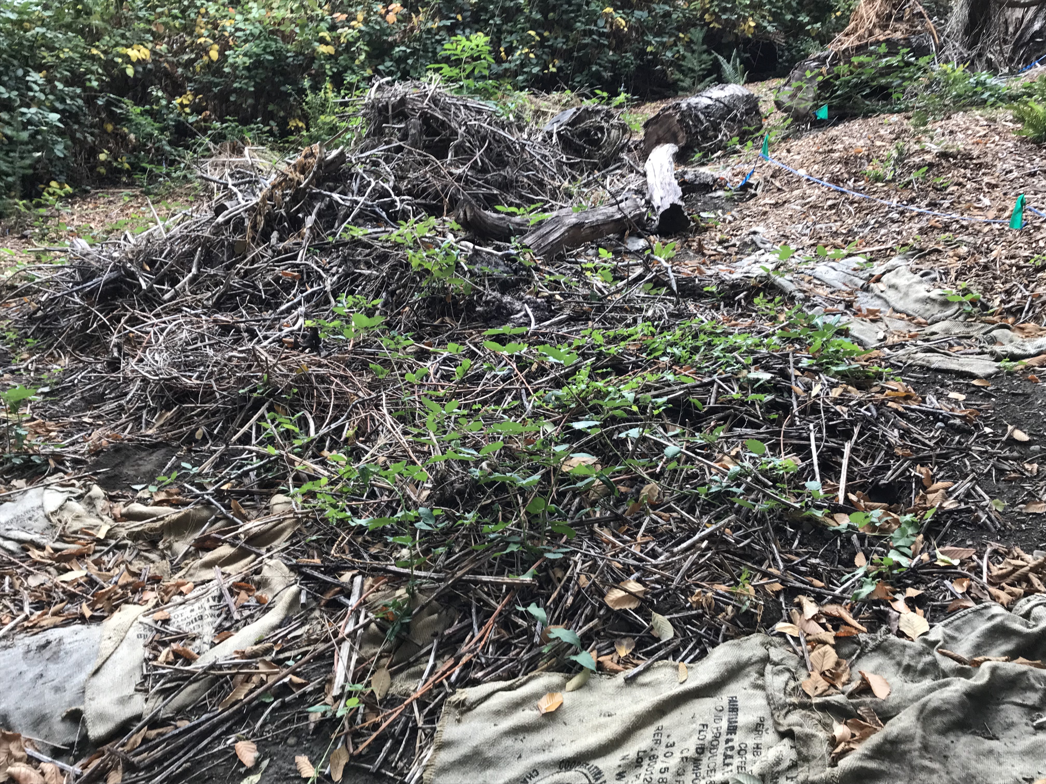 During the last two years, when we cut or pulled out vines such as blackberry, ivy and bindweed, and when we dug out blackberry root balls, we usually took the waste to the foundation of a house that exists on our Greenbelt site. Once there, we placed the waste on drying racks that we had built inside the foundation. We call that area “The Rack Zone” and we generally refer to the dried vines, branches and root balls as “debris.”