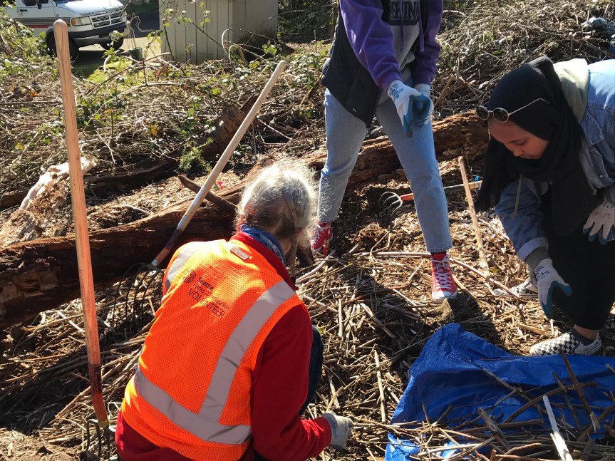 In the photo below, a team leader is teaching the students how to dig out blackberry root balls. If you look up the hill from where they are standing, you will also see some of the larger group working in the southwest area. By the time this photo was taken, both groups had removed most of the debris in their areas.