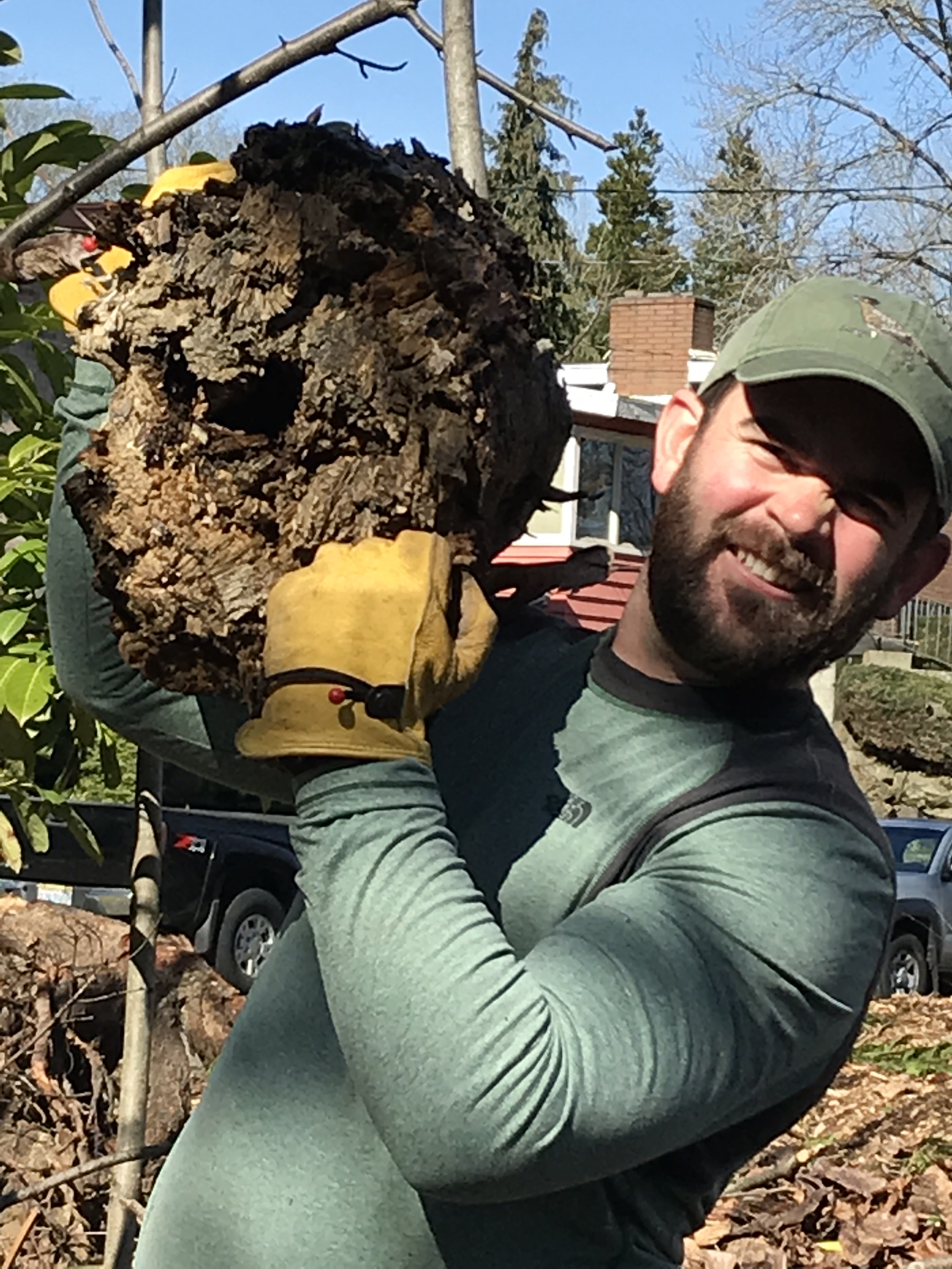 The tree had fallen from the top path, over the old house foundation that is on the property, and partially over the planting area that is below the foundation. We hadn’t realized how big the tree was until it fell; it must have been at least 80 feet tall. The photos in this post are primarily from the tree’s bottom and top so in no way do they show its full magnitude.