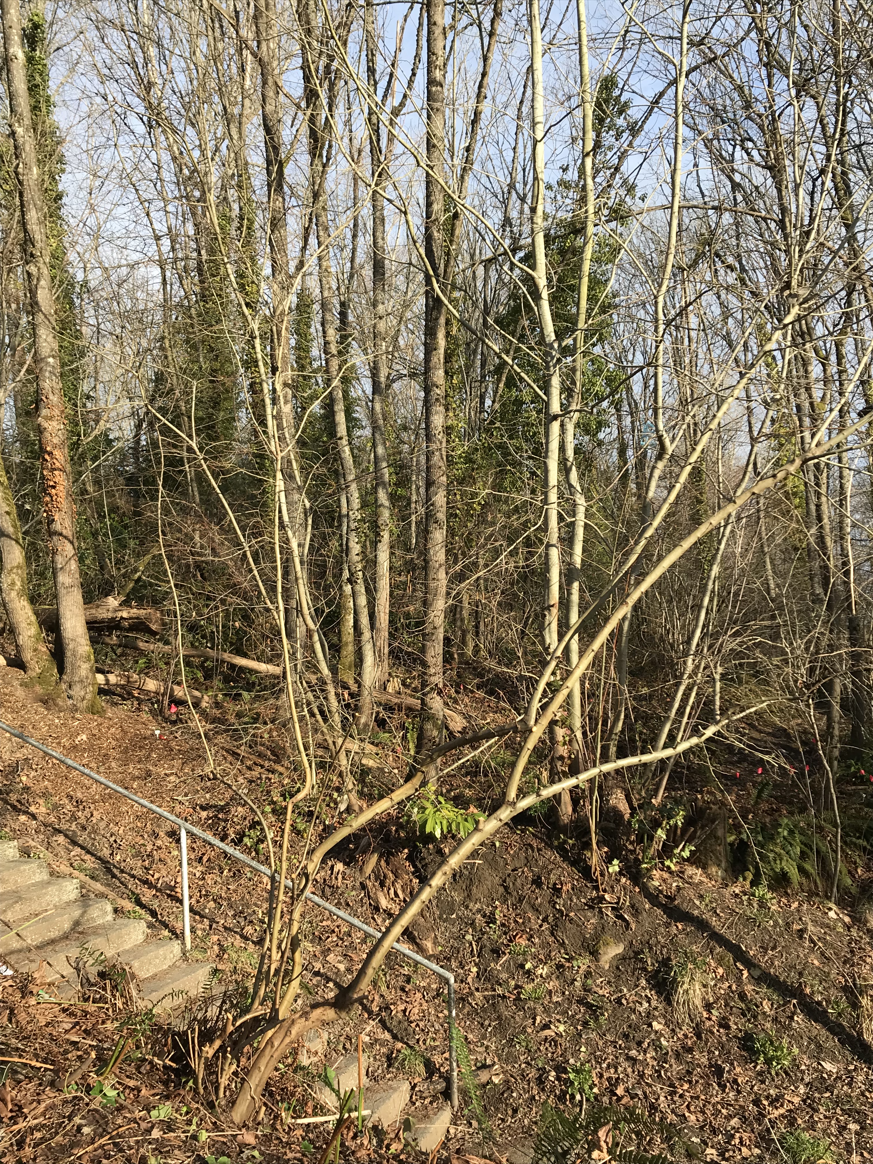 I’ve had a lot of “Oh No” experiences lately; ones that relate to the new Greenbelt site we’ve agreed to help with. Our main site is south of the stairs that begin at the intersection of 25th Avenue S and S Hanford Street in Seattle. About three years ago, the Department of Transportation built a second set of Hanford Stairs across Cheasty Boulevard. They are lower on the side of Beacon Hill than our main site. There is Greenbelt property on both sides of the lower stairs.