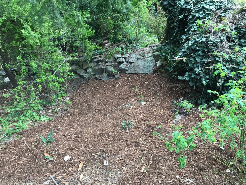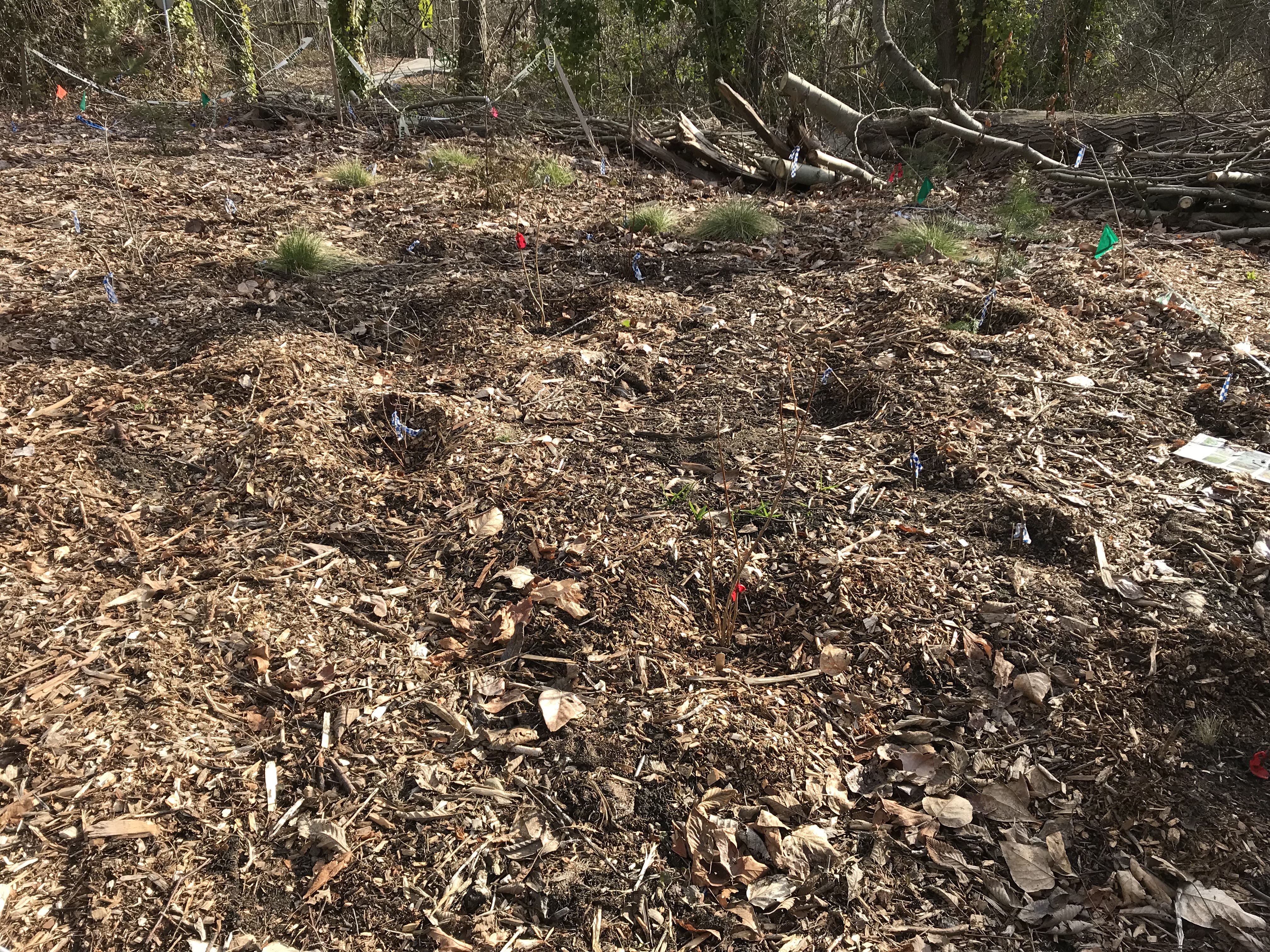 Neither Shirley nor I had taken any photos of the group that had cleared weeds in the planting area near the wood chip pile earlier in the work party but I did get one of what the area looked like after it was cleared. Imagine the area in the photo below with 100+ invasive vines emerging from the ground and you will get a sense of what it looked like at the beginning of the work party.