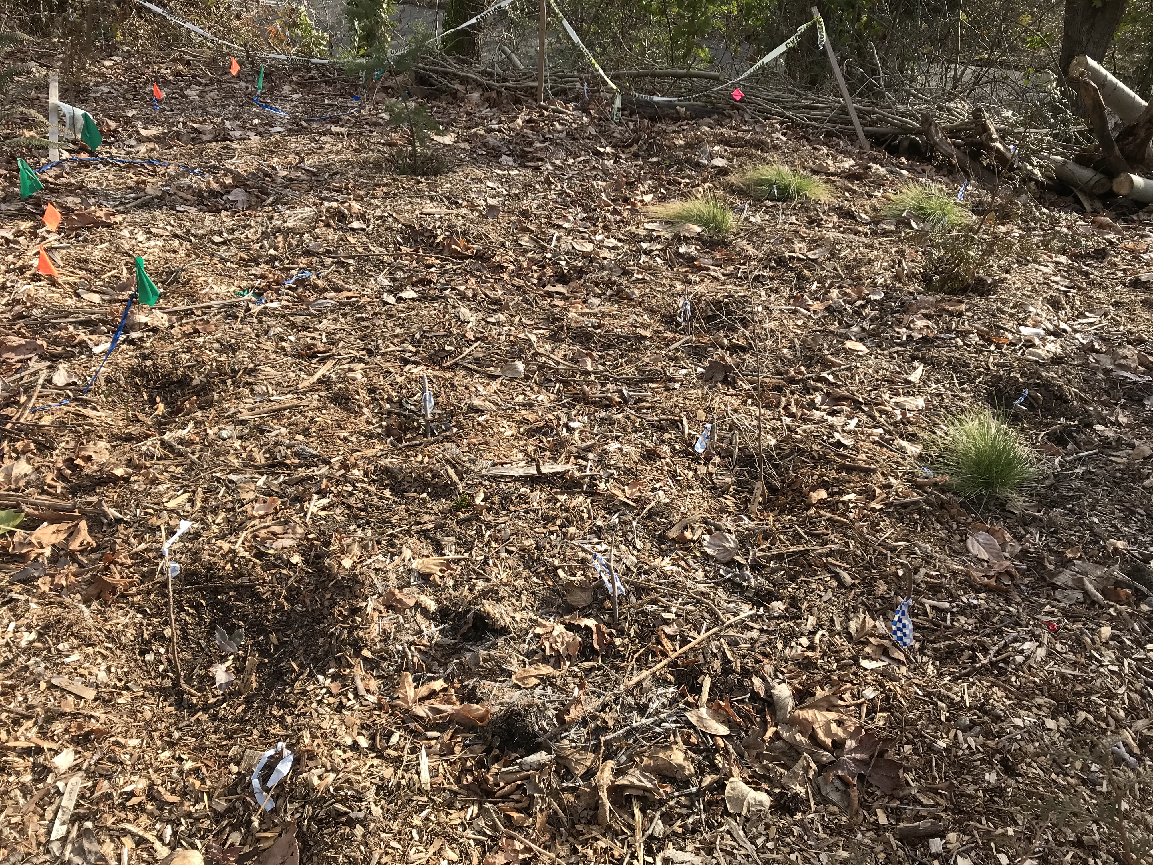 Prior to this work party, I marked the places where new plants will be planted. In each space, I placed a pink flag, a white sign that indicates the name of the plant and a stick with red and black flagging tape. The red and black tape indicates that the item was planted during the 2018-19 planting season.