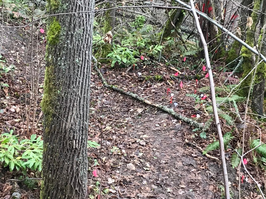 The third group of volunteers worked in the lower planting area that is on the north side of the Hanford Stairs and near Cheasty Blvd. Their task was to see that all three markers had been left for each future plant .