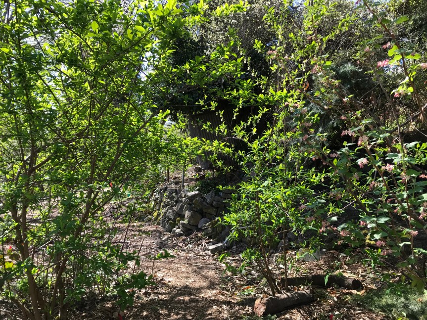 A second group started to clear an area that hadn’t been cleared before, one that bordered our southern planting area. Dense blackberry vines and other weeds were impinging on, or had actually begun to cover, some of our shrubs and ground covers. The third group removed weeds from the north side of the Hanford Stairs.
