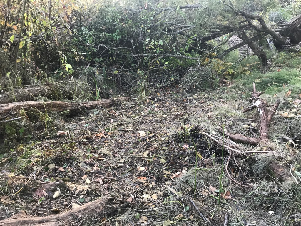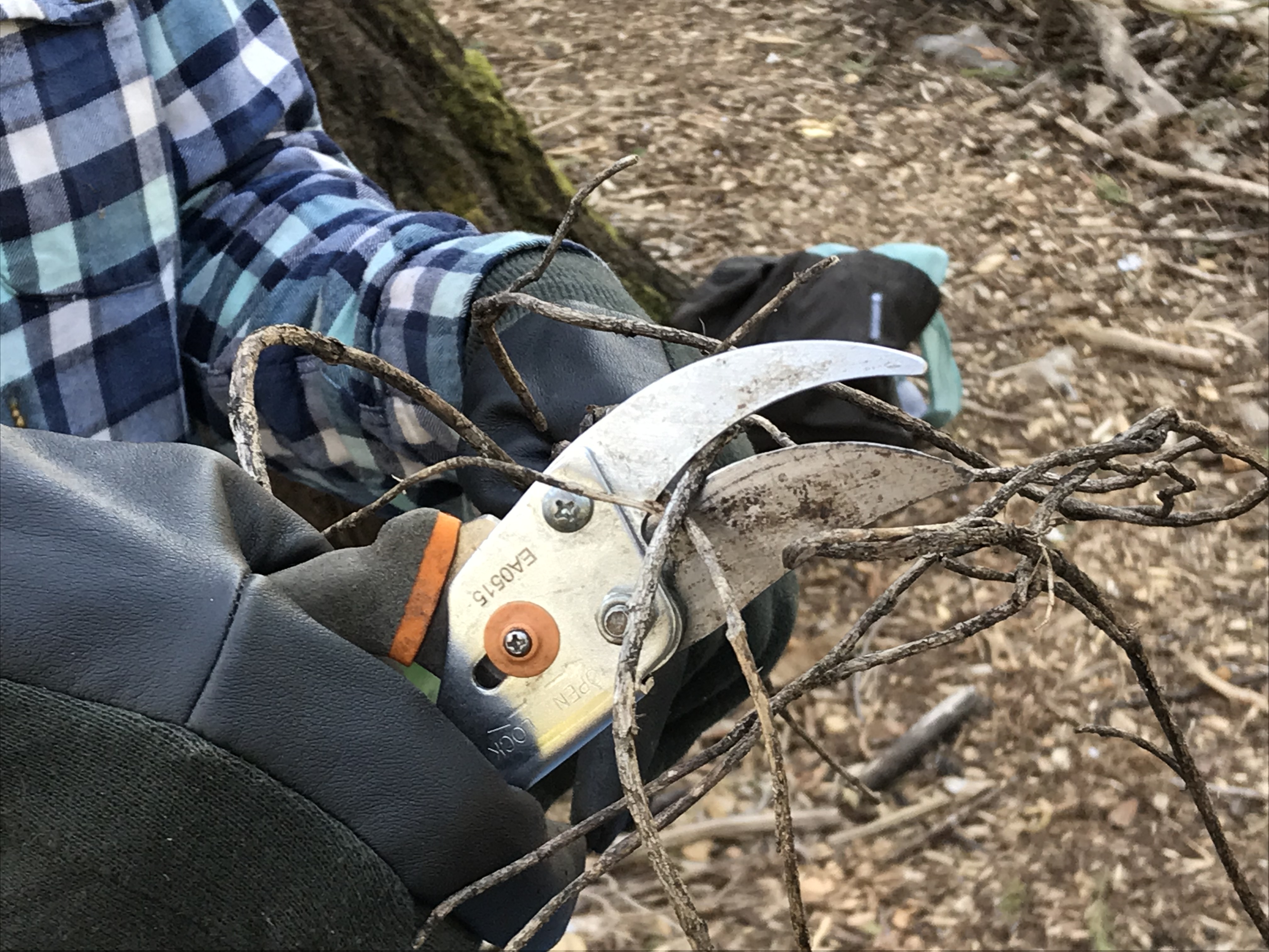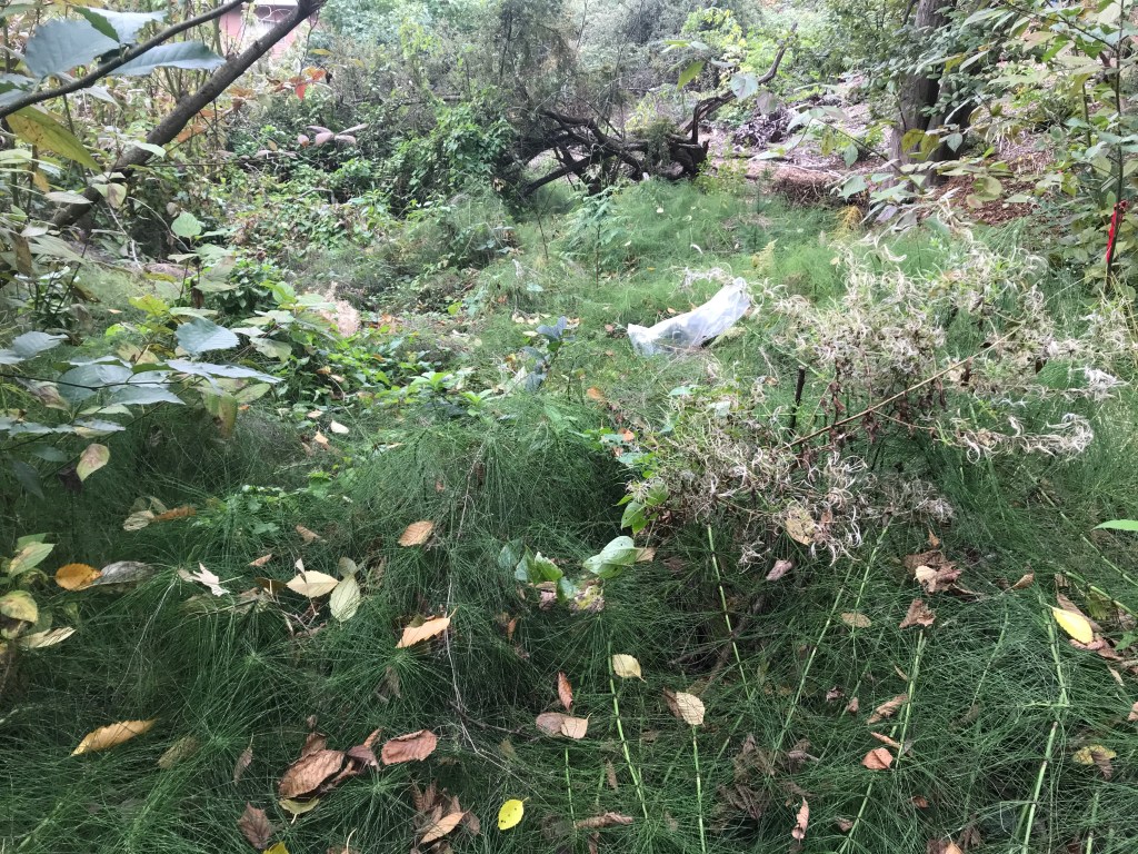 We worked in an area that was full of horsetails, bindweed, dried branches and other weeds. The horsetails had started to die down for the year, but there were years of dried stalks underneath the live ones. We left the live horsetails alone as much as possible because they are a native plant. However, it often wasn’t possible to remove the bindweed without removing the horsetail, because both break easily. The horsetails have been around since before the dinosaurs, though, so we know they will be back in the Spring!