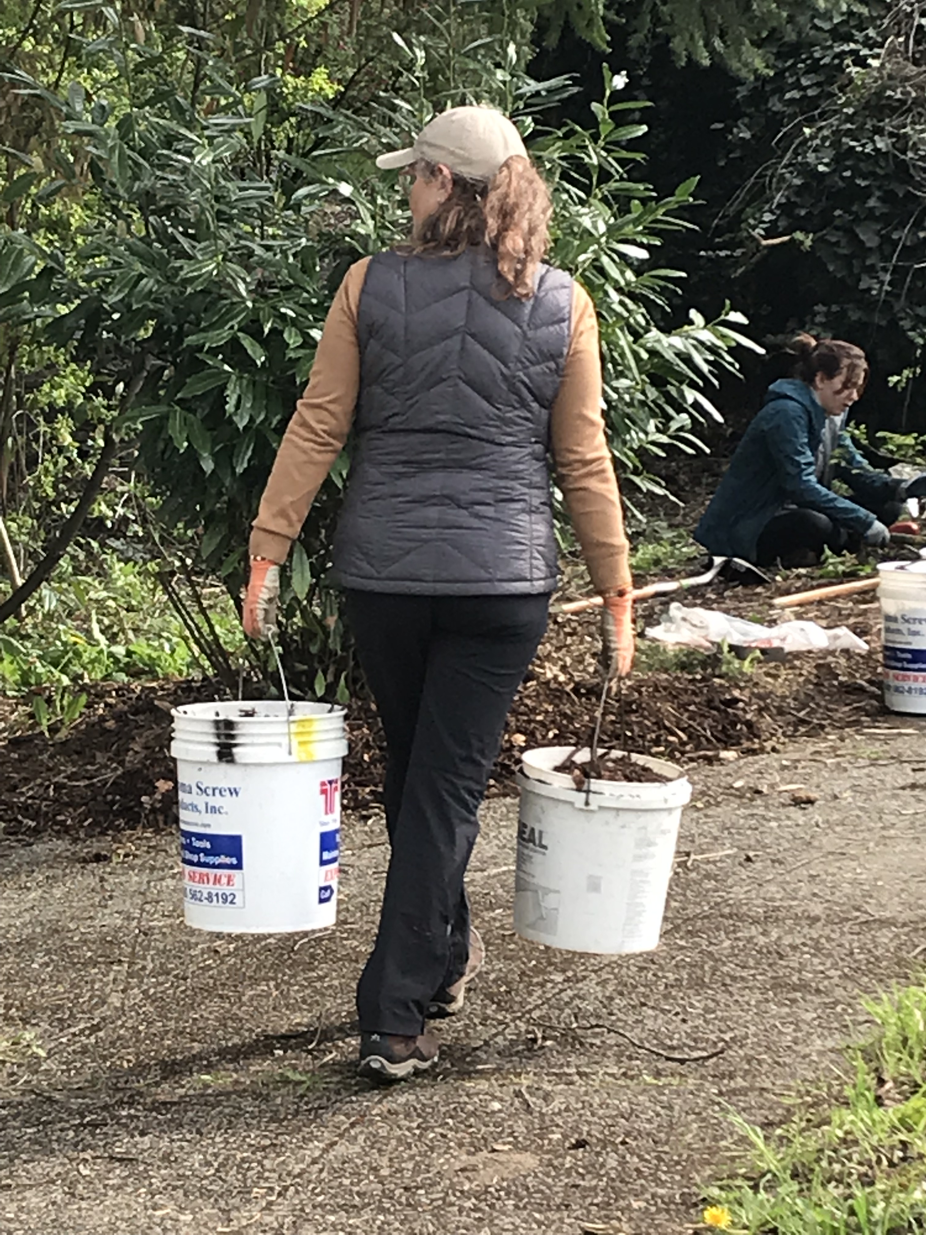 One day in mid-March, Lillie, a woman whom I had seen on the Hanford Stairs numerous times, stopped and talked with me. I invited her to help with the restoration work and she was interested. The first time she came, we cut up debris from the fallen pine tree branch and scattered it on an area where I had removed a drying rack.
