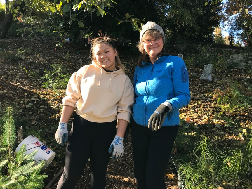 So, after all of us spent some time looking at the exposed tree roots, we began the planned activities for the day. Most of the students started removing weeds, wood chips and leaves from around all of the trees, shrubs and ground covers we had planted on the site since 2017. Having bare ground around each plant helps water reach the plant roots when it rains. The UW Capstone interns were team leaders for the UW service-learning students during this work party.